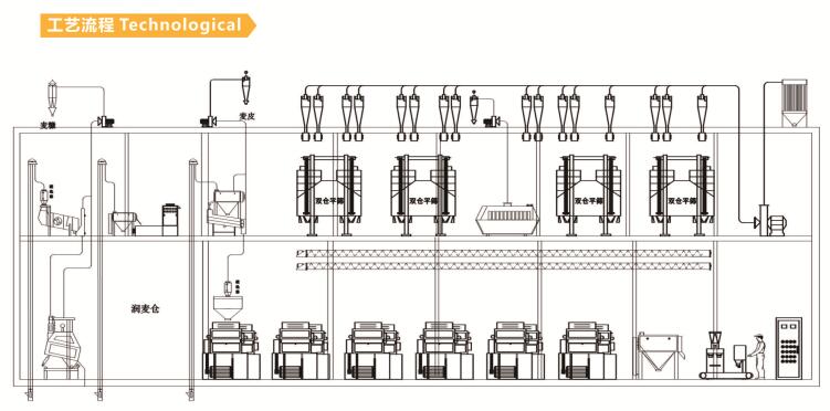 制粉間工藝:采用四皮四芯 渣、分級(jí)采用四臺(tái)篩外分級(jí)篩、 刷麩、篩粉采用三部雙倉平篩、生產(chǎn)效率高、維修方便、磨機(jī)粉采用對(duì)輥研磨、同步帶傳動(dòng)、生產(chǎn)效率高、噪音小、無粉塵外揚(yáng)、維修方便等特點(diǎn)。